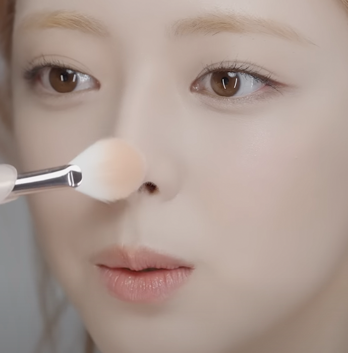 Using the same blush, she lightly taps the leftover product along the sides of her nose to create a soft, seamless transition that ties the look together naturally.