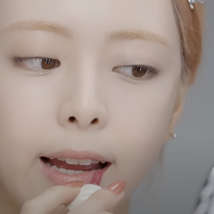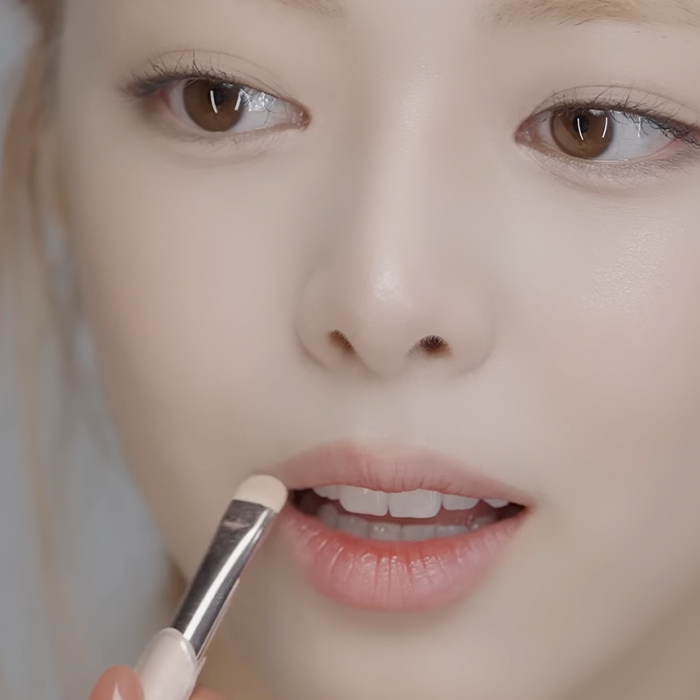 To gently elevate the corners of her lips, she applies the same blush in Pillow to softly outline the outer edges. This delicate hue provides her lips with a naturally lifted appearance, eliminating the necessity for a lip liner.