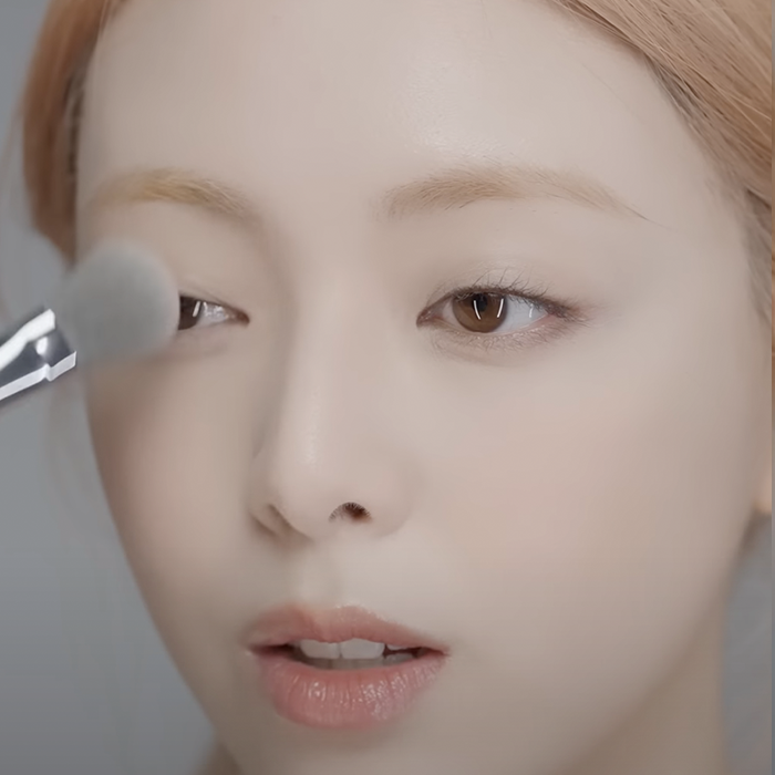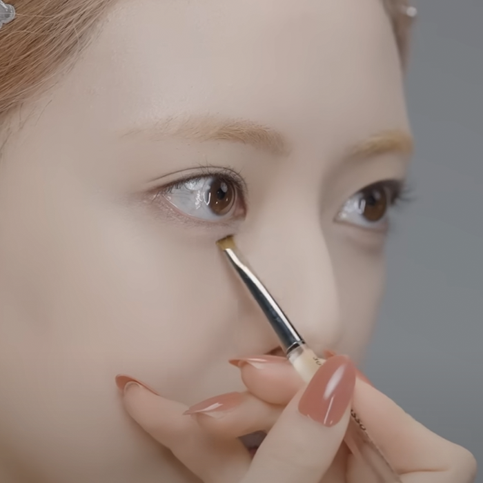 Using a flat angled brush, she dips into the second lightest shade in the palette and softly defines her aegyo-sal—starting from the centre of the under-eye, extending it outward, then blending it gently toward the inner corner.