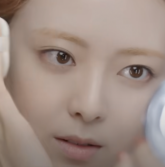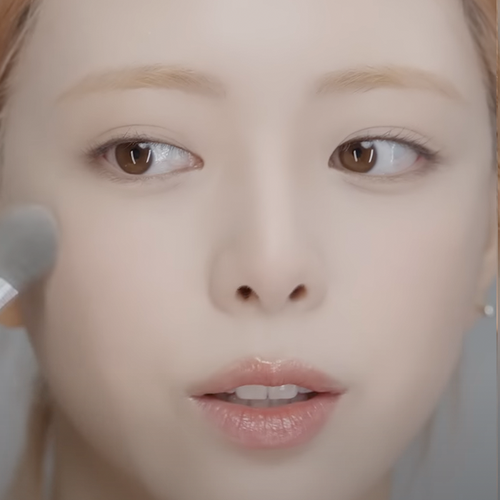 Yuna starts by gently patting the puff on the side of the compact, then places it flat against her forehead and the inner cheeks, slowly spreading the product outward to the rest of her face.