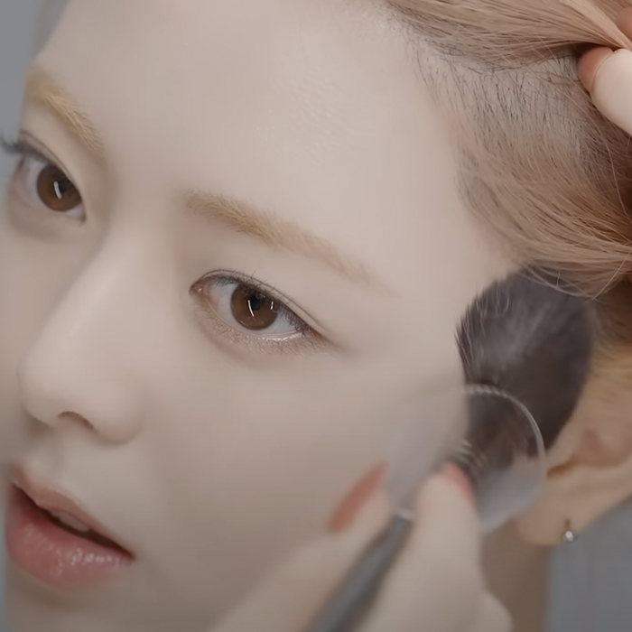She employs the NAMING Fluffy Volume & Shading Duo palette along with a soft pointed brush to delicately contour essential areas — gently gliding along the tops of her cheekbones, jawline, and hairline. This method introduces a subtle depth and structure, accentuating her natural features while ensuring a soft, harmonious finish.