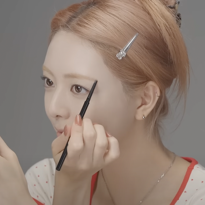 Starting from the inner corners, she uses gentle, feather-like strokes that reach the center of her brows, mimicking the look of real hair. Then, she gently blends them to remove any sharp lines, resulting in a softer, more natural appearance.