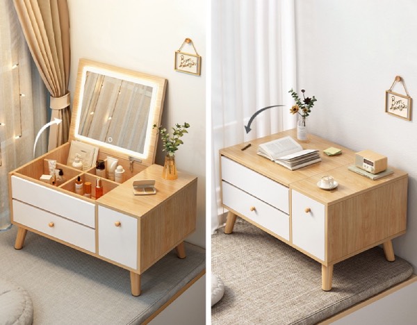 For those who prefer doing their makeup seated on the floor, this compact vanity table is the perfect choice. Unlike traditional options, it’s not only small but also short in height. But don’t be fooled by its size — it still has a good amount of space to store all your daily essentials.
