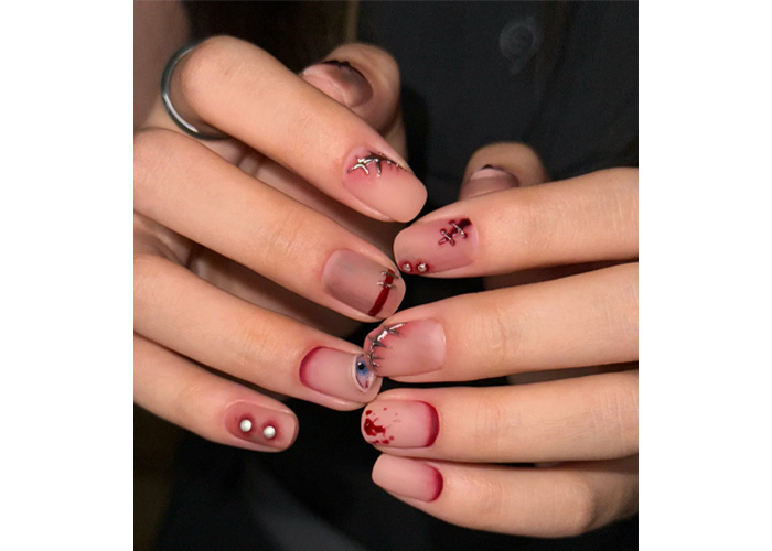 This Halloween, let your nails take centre stage with the “Blood Eye” design. Picture a skin-toned base adorned with metallic stitches and just the right splash of gore – like artful cuts from a stylish horror flick.