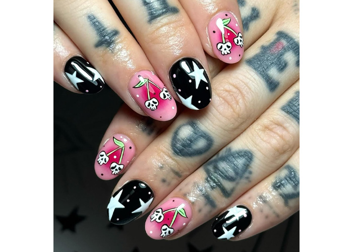 Sweet meets spooky in this “Cherry Skull” manicure that’s equal parts flirt and fright. Black nails with black dots and white stars set a celestial backdrop, while pink ombré centred gradient nails – fading from hot to baby pink – steal the show with hand-painted skulls dangling like cherries on their stems.
