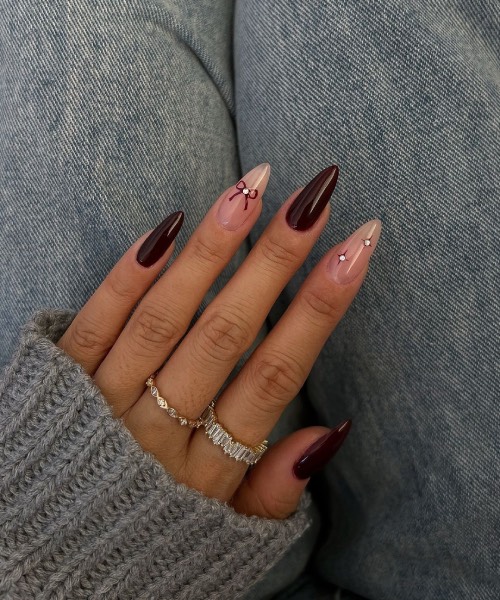 Upgrade your style with this stunningly beautiful cherry mocha nail. Its maroon-brown shade paired with a nude base adorned with sparkly stones truly compliments one another. This classy nail design combines deep tones with a hint of shimmer for a glamorous finish. It’s the perfect choice to add a touch of luxury to your Raya outfit or any upcoming special occasion.